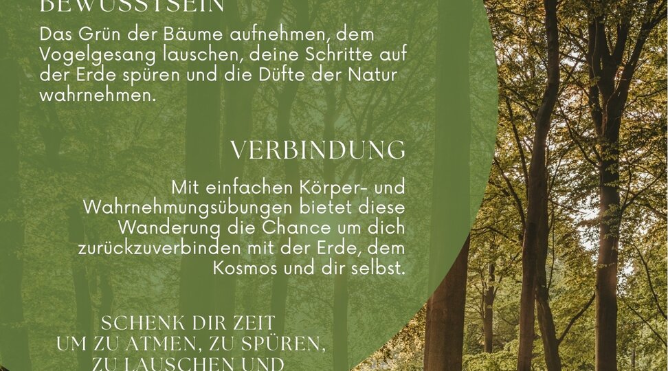 Das Grün der Bäume aufnehmen, dem Vogelgesang lauschen, deine Schritte auf der Erde spüren und die Düfte der Natur wahrnehmen.