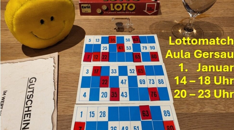 Gespielt wird jeweils von 14.00 –18.00 Uhr und von 20.00 – 23.00 Uhr. Fordern auch Sie beim weltweit ersten Lottomatch im neuen Jahr Ihr Glück heraus und kommen Sie für ein paar gemütliche Lottorunden in der Aula vorbei.